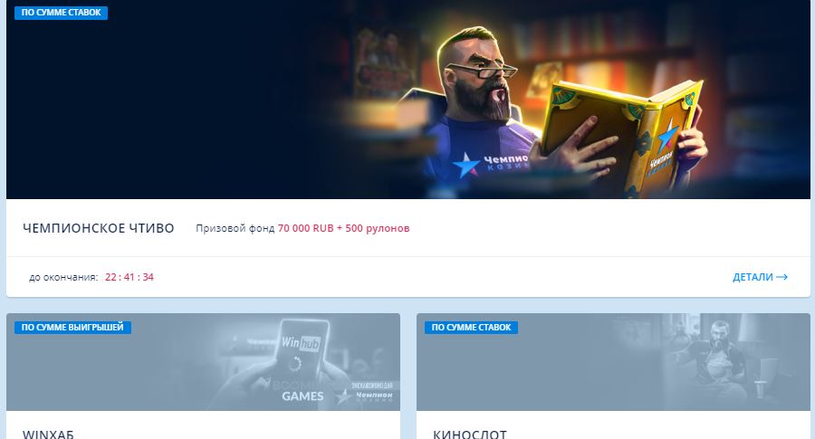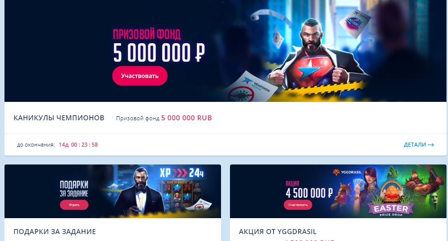 Ну что могу сказать. Лучше чем Чемпиончик я не встречал. Где вы найдете еще такие интересные турниры, как там? В которых даже машины разыгрывают и телефоны. СЛоты постоянно дают деньги выигрывать… советую!